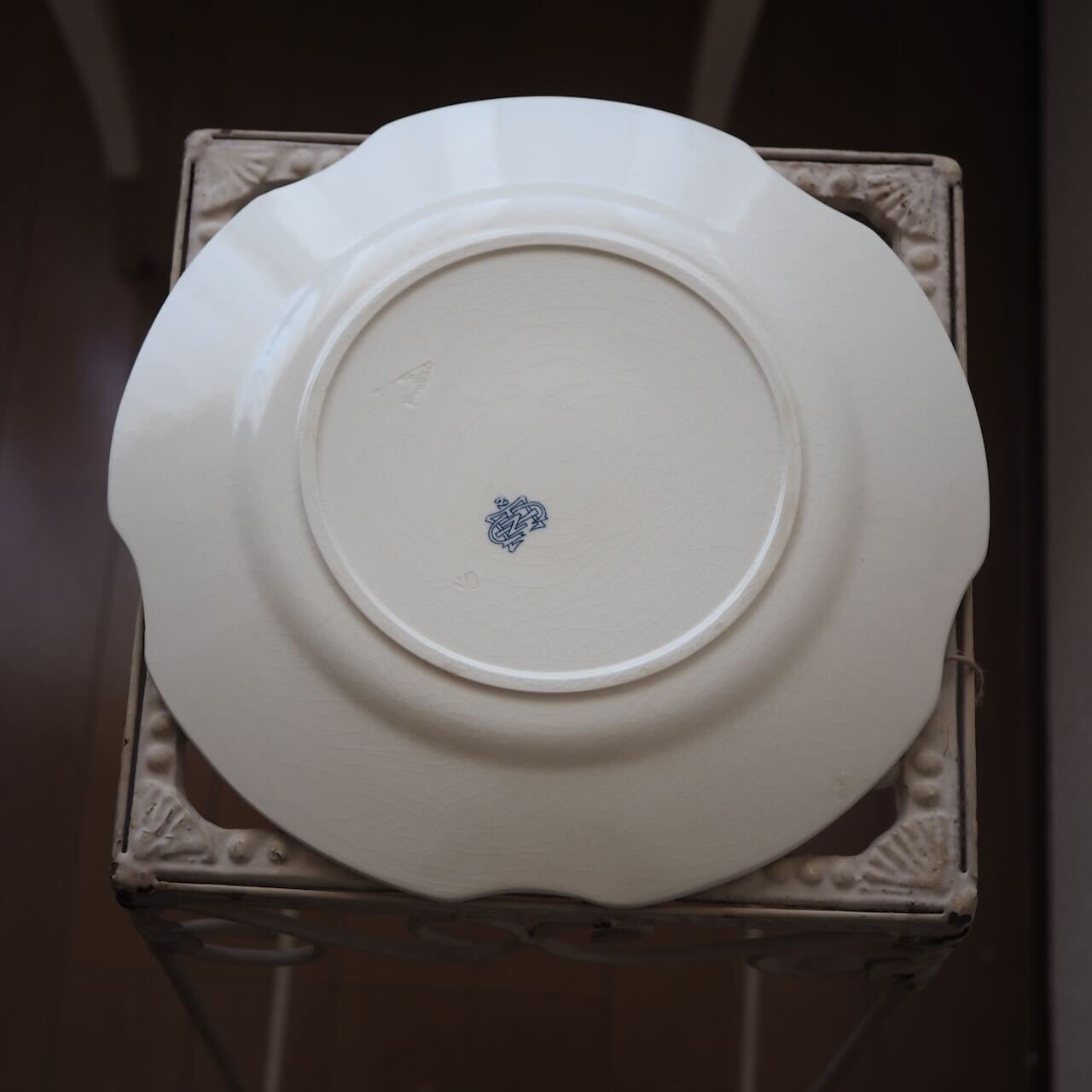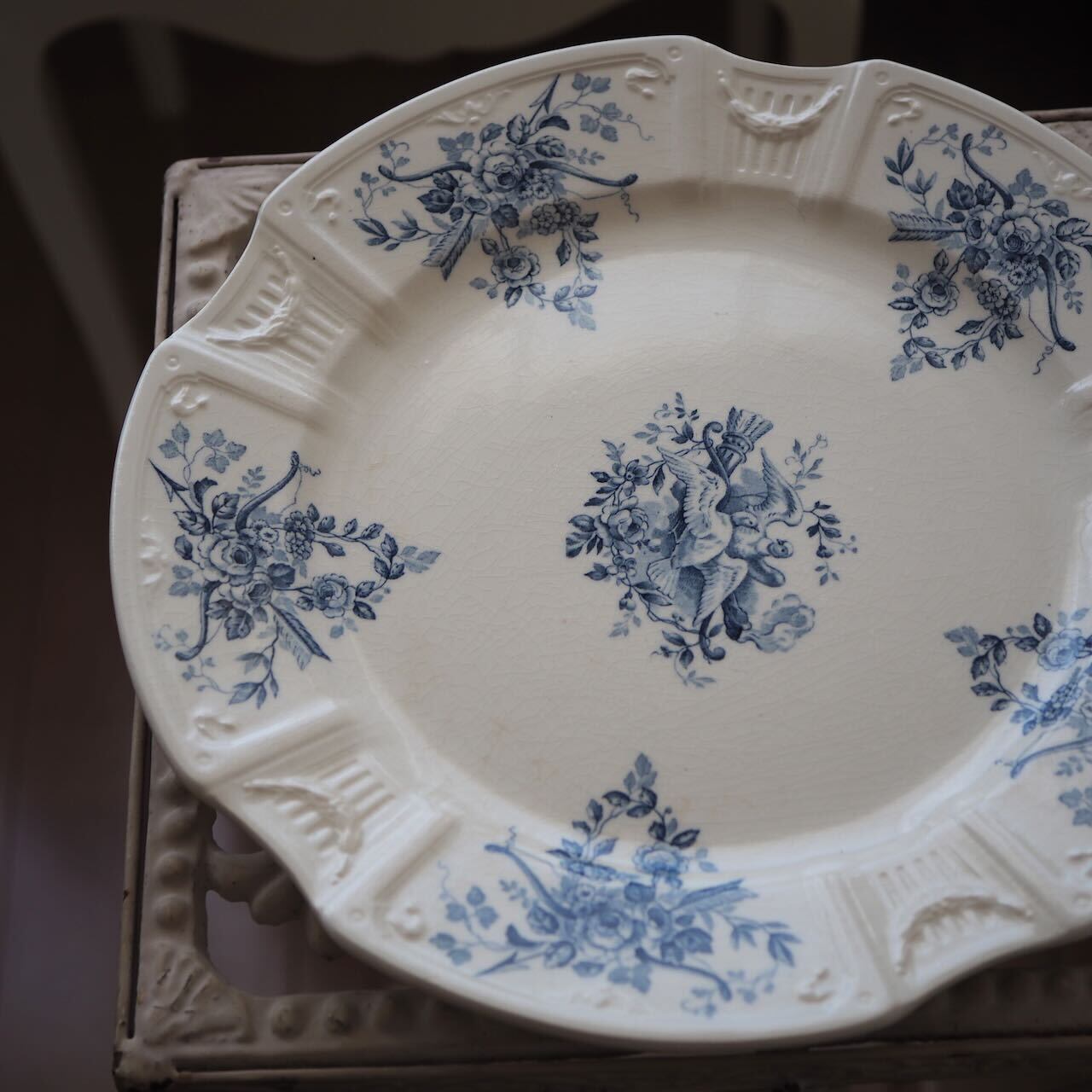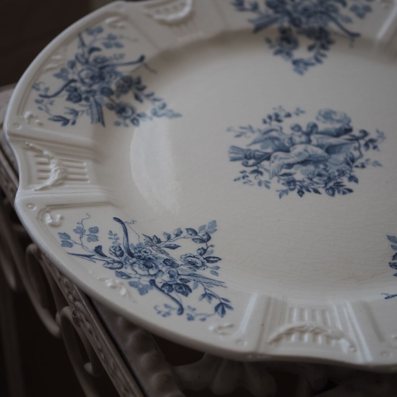 オフホワイトにジアン・ブルーで描かれた鳩と花々。鳩には様々な意味がありますが、つがいで描かれていること、矢が描かれていること、バラが描かれていることから、やっぱり「愛」「平和」がテーマのお皿なのだと思います。