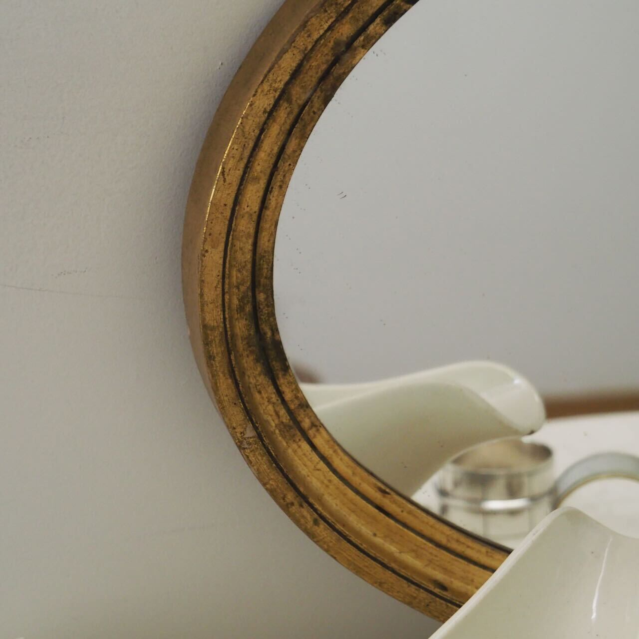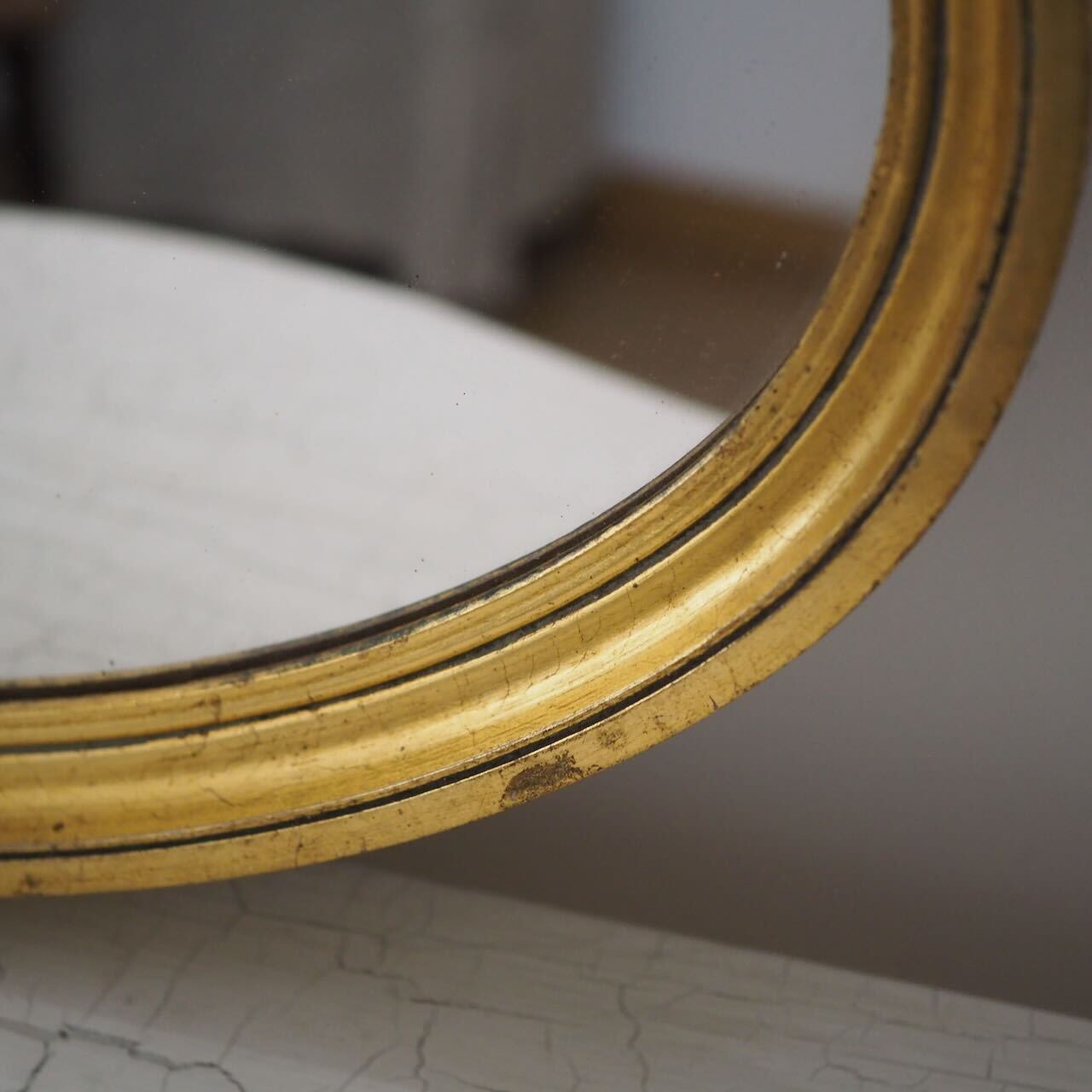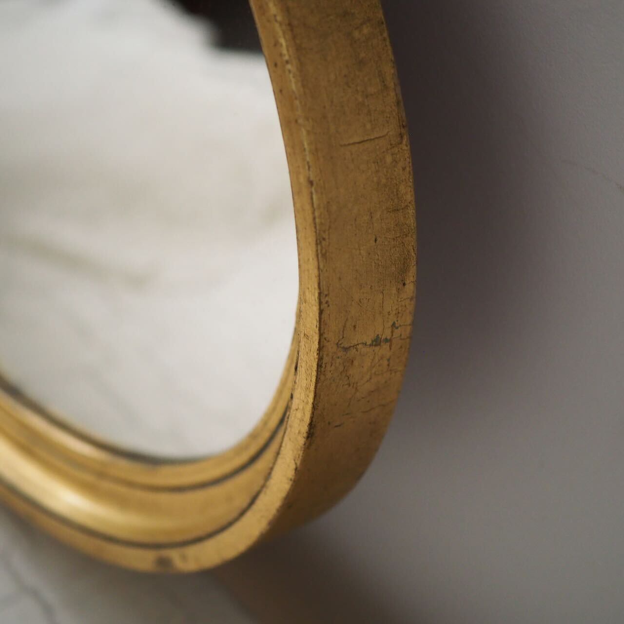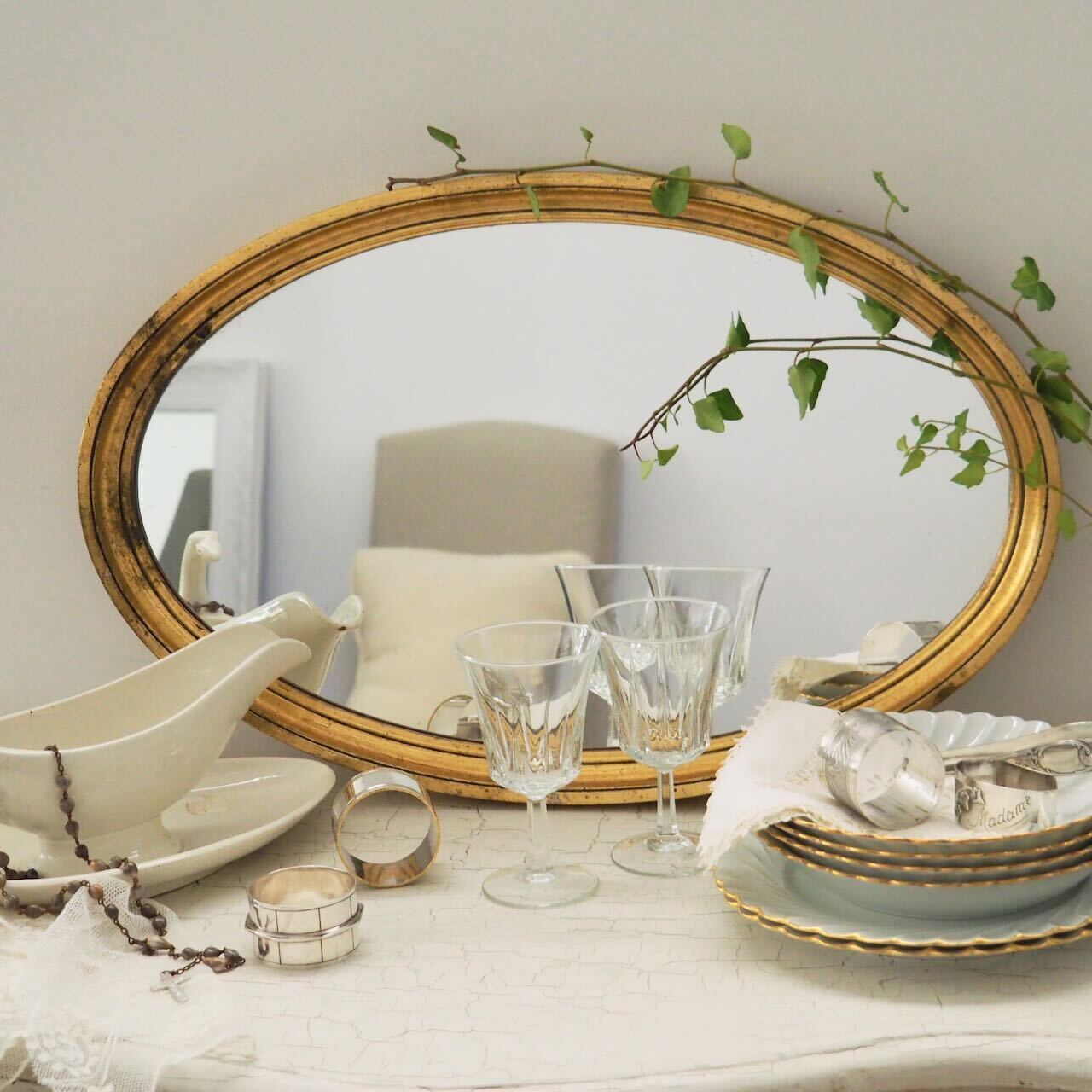 南仏のブロカント市で見つけた状態のいいアンティークミラーです。落ち着いたゴールド。横長の楕円ミラーはおしゃれでシック、ちょっと個性的な印象です。ありそうで意外とないタイプ。