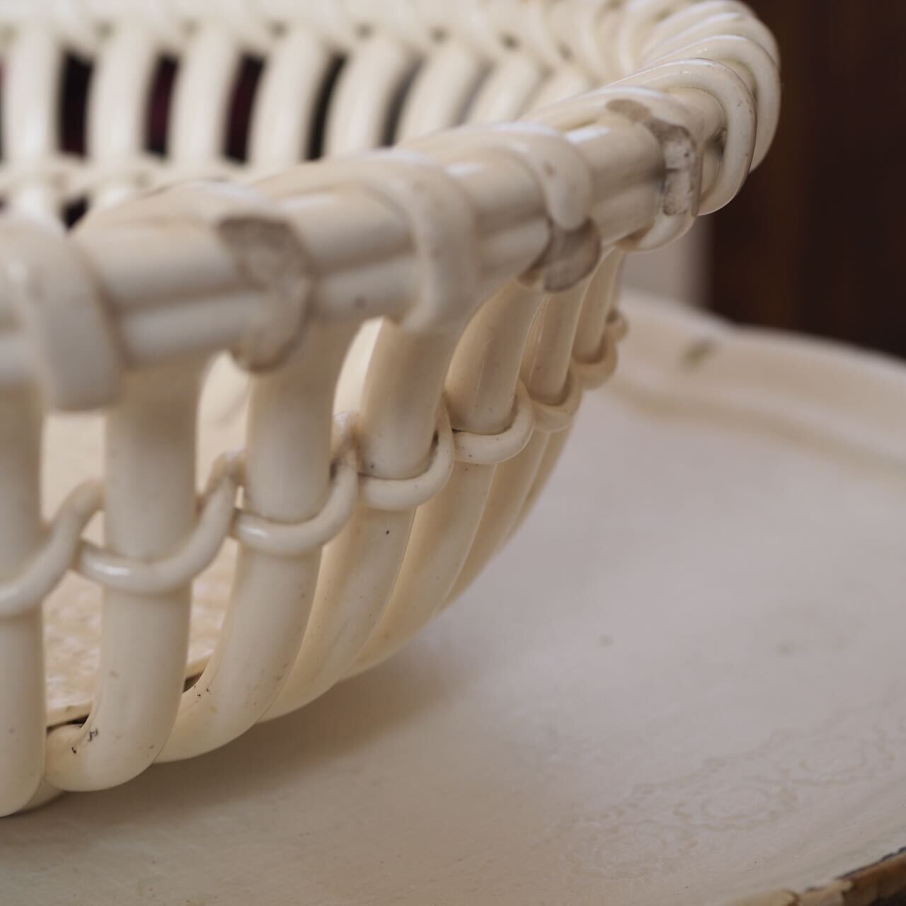 陶器で籠を表現したコルベイユ(籠)です。みごとに編み上げられた芸術品。カケた部分が一部いくつかありますが(写真)、全体の美しさのなかに溶け込んでほとんど気になりません。