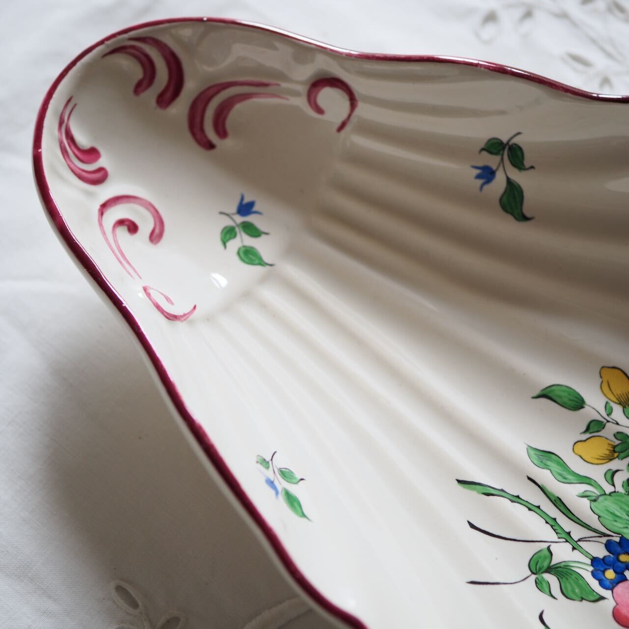 フランスの伝統デザイン、コキーユ(貝)をデザインしたシェル型ラヴィエも、リュネヴィルの"REVERBERE"シリーズになると、こんなにキュートになります。描かれているのはバラが主役のカラフルなブーケ。陶肌は白。ピンクの縁取りです。
