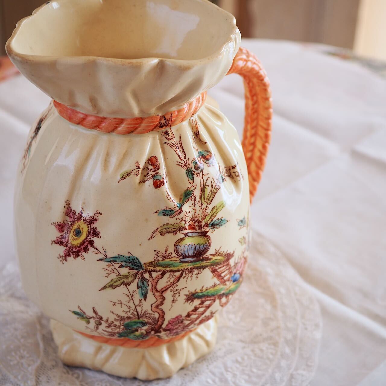 サーモンピンクが最高にかわいい大きめピシェです。布をくしゅっと紐で縛ったような仕立てになっていますが、リュネヴィルの技術の高さを改めて感じさせるお品です。その技術を玄人好みの方向ではなく、女性たちに「かわいい」とため息をつかせるものを生み出すのに使い続けた窯なのかなと思います。あのマリー・アントワネットに愛された窯というのもわかります。